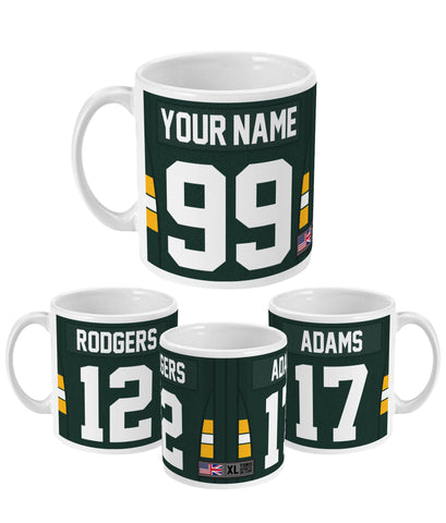Show support for your favourite US American Football talents with our Green Bay custom personalised link up mug. Perfect for enjoying the game with your feet up at home or repping your team loud and proud in the office at work.